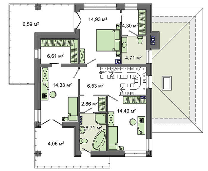Chic house with glazed balconies and terraces Number of floors: 2 Total area: 205.31 m2 Living Area: 93.39 m2 House height: 9.24 m Ceiling Height: 2.80 m Roof Angle: 24 ° Roof area: 230.50 m2 Cubic capacity: 532.00 m3 Number of bedrooms: 4 Number of bathrooms: 3 Garage: Garage for one car Minimum plot size (length): 20.00 m Minimum plot size (width): 19.00 m Built-up area: 212.14 m2 Materials: Walls: aerated concrete blocks Overlap: monolithic overlap Roofing: metal tile, ceramic tile, bitumen Foundation: monolithic tape