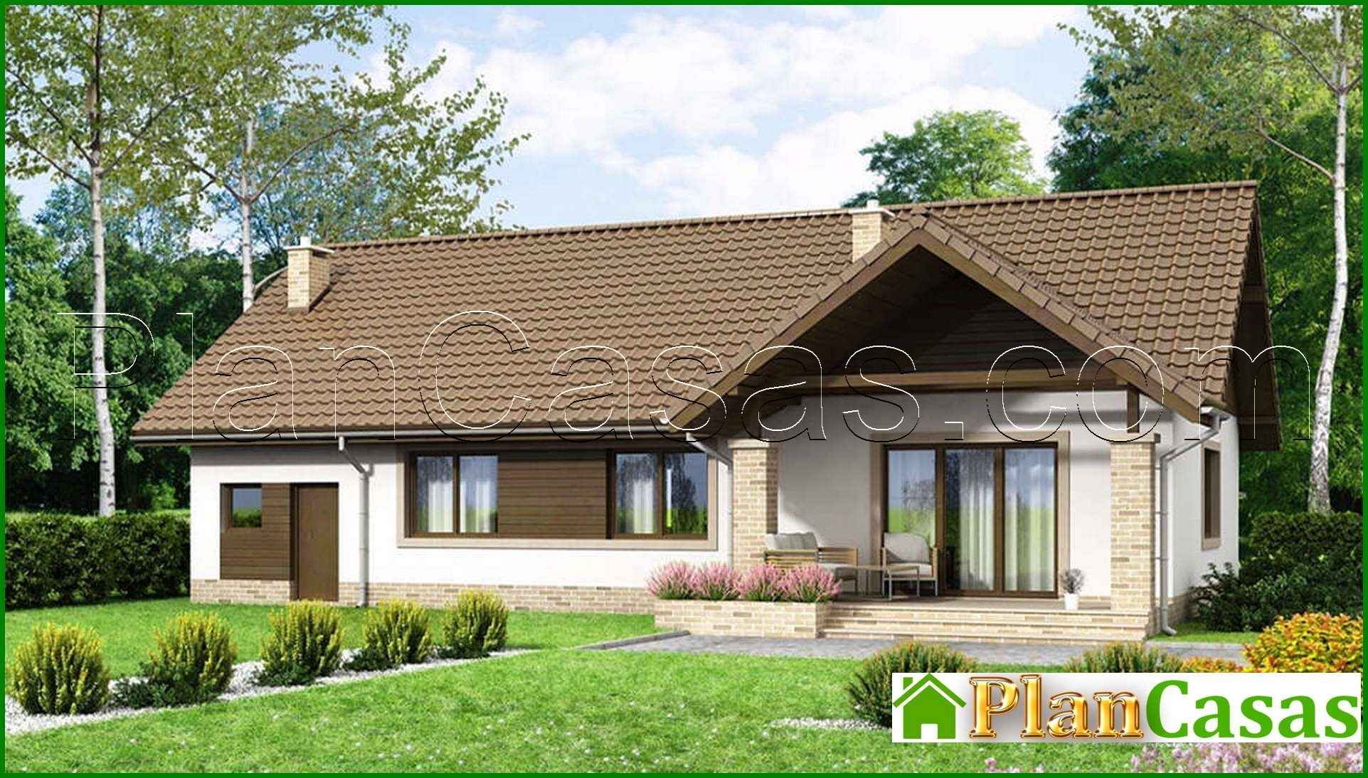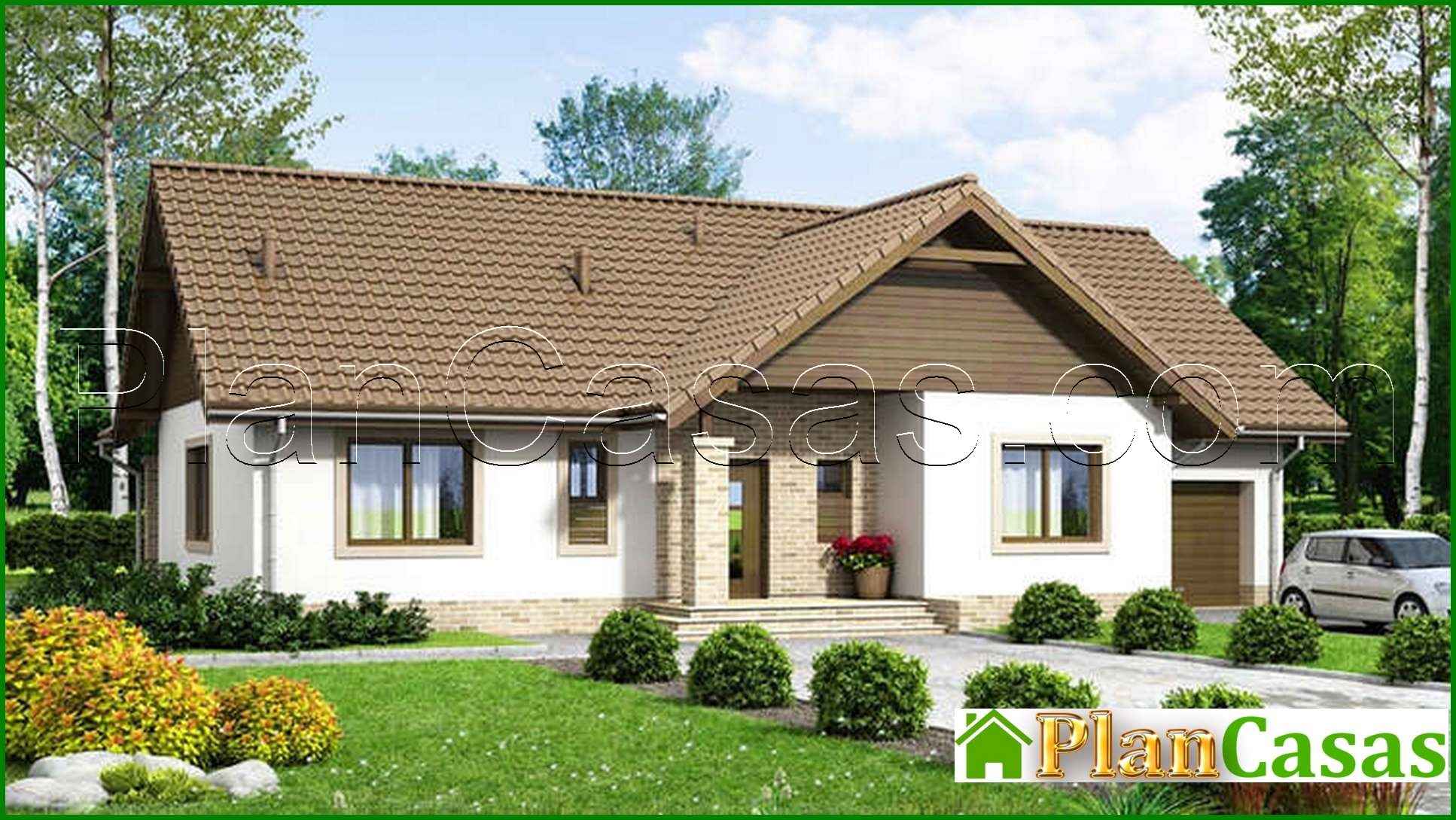 Three-bedroom one-story house project Number of floors: 1 Total area: 145.66 m2 Living Area: 69.67 m2 House height: 7.40 m Ceiling Height: 2.80 m Roof Angle: 35 ° Roof area: 299.00 m2 Cubic capacity: 1071.39 m3 Number of bedrooms: 3 Number of bathrooms: 2 Garage: Garage for one car Minimum plot size (length): 24.00 m Minimum plot size (width): 19.00 m Materials: Walls: aerated concrete, ceramic blocks Ceiling: on wooden beams Roofing: metal tile, ceramic tile, bitumen Foundation: monolithic tape