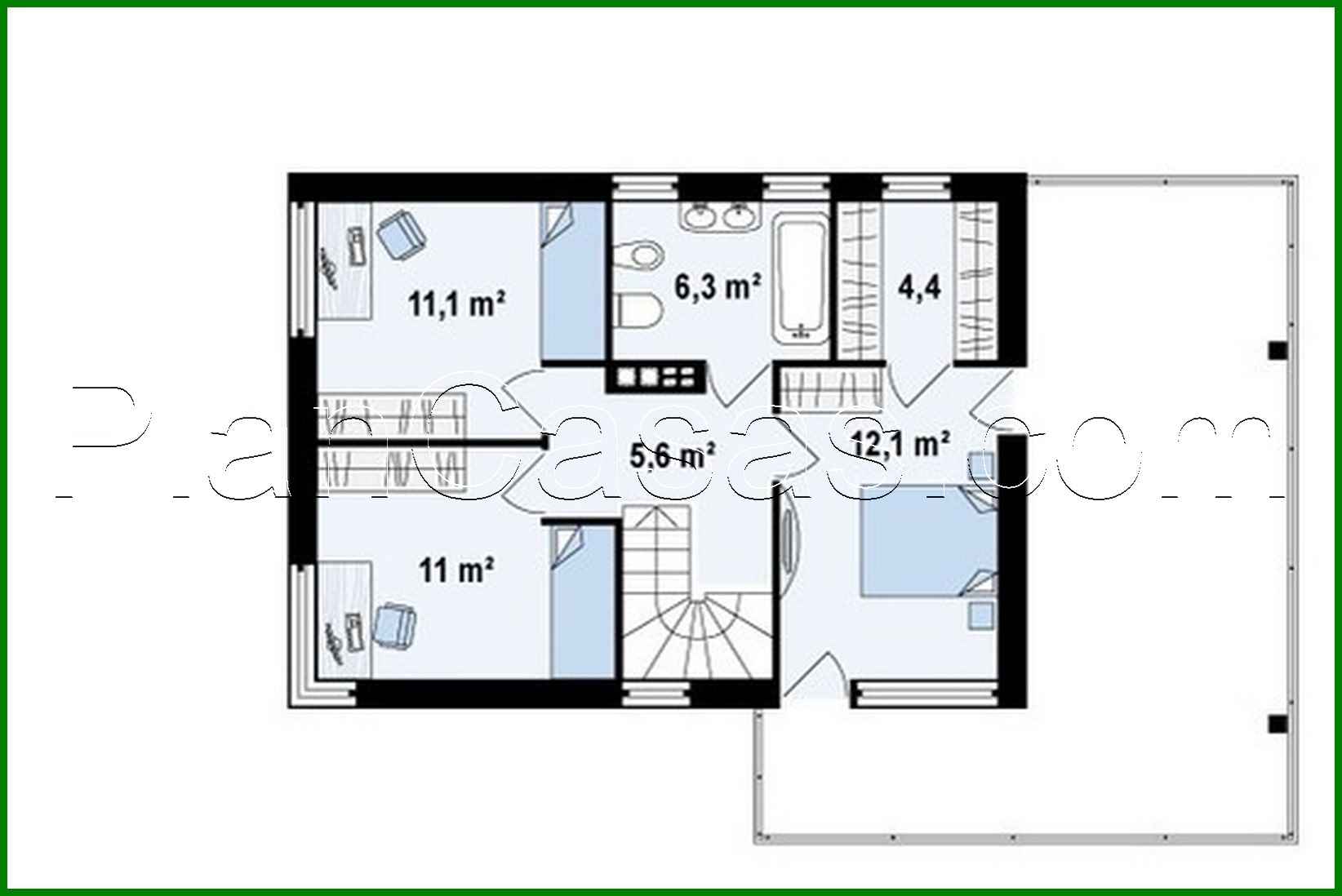 Project of a modern two-story cottage with a summer terrace Number of floors: 2 Total area: 147.45 m2 Living Area: 62.44 m2 House height: 7.16 m Ceiling Height: 2.80 m Roof Angle: 1.5 ° Roof Area: 57.47 m2 Cubic capacity: 381.00 m3 Number of bedrooms: 4 Number of bathrooms: 2 Garage: Garage for one car Minimum plot size (length): 20.44 m Minimum plot size (width): 16.94 m Materials: Walls: aerated concrete, ceramic blocks Overlap: floor slabs Roofing: PVC membrane Foundation: monolithic tape band