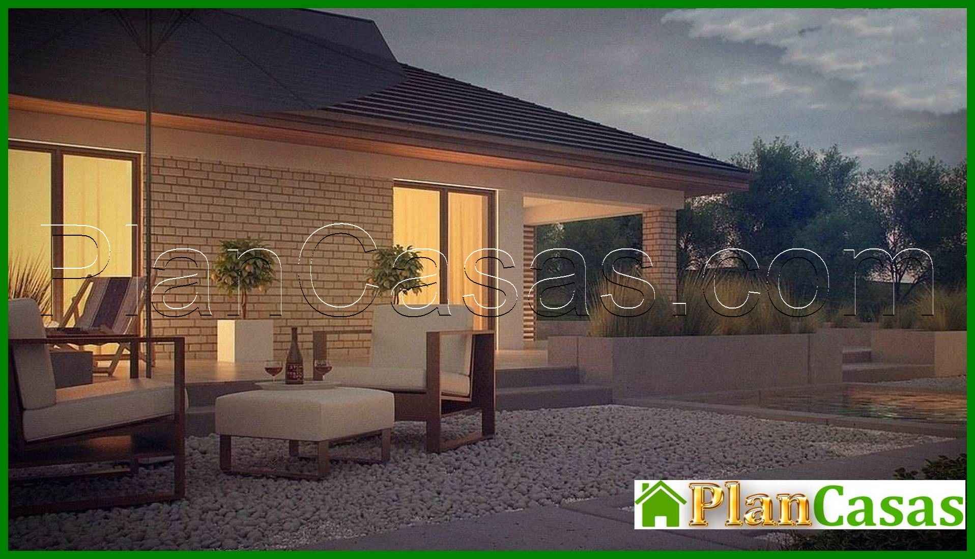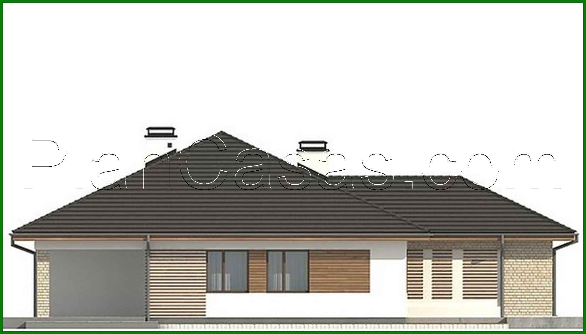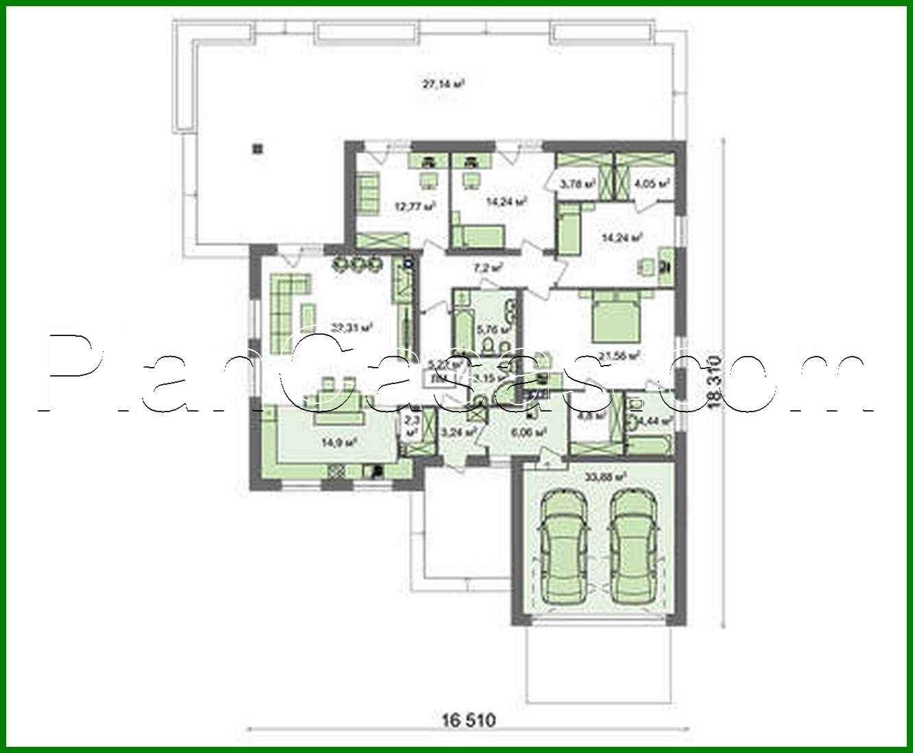 One-storey house project with a terrace Number of floors: 1 Total area: 221.04 m2 Living Area: 95.12 m2 House height: 7.05 m Ceiling Height: 2.80 m Roof Angle: 25 ° Roof area: 341.50 m2 Number of bedrooms: 4 Number of bathrooms: 3 Garage: Two-car garage Minimum plot size (length): 20.44 m Minimum plot size (width): 22.24 m Built-up area: 381.6 m2 Materials: Walls: aerated concrete blocks Ceiling: on wooden beams Roofing: ceramic tile, metal tile, cement-sand tile Foundation: monolithic slab