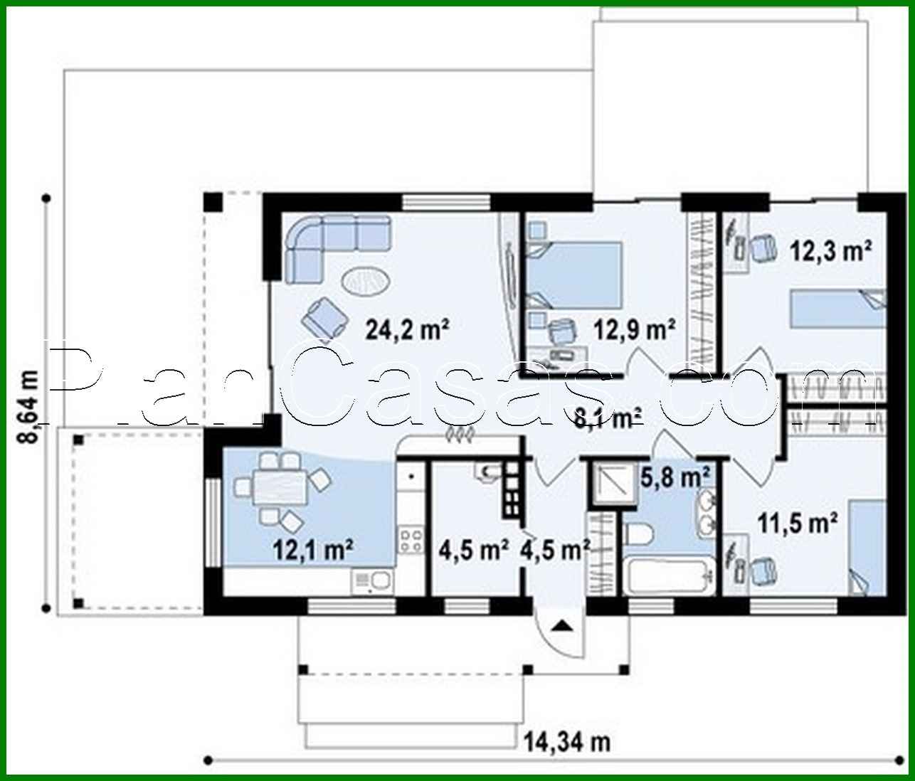 Project of a small modern one-story house Number of floors: 1 Total area: 95.90 m2 House height: 6.71 m Ceiling Height: 2.80 m Roof Angle: 30 ° Roof area: 136.00 m2 Cubic capacity: 255.00 m3 Number of bedrooms: 3 Number of bathrooms: 1 Minimum plot size (length): 21.34 m Minimum plot size (width): 16.81 m Materials: Walls: aerated concrete, ceramic blocks Ceiling: on wooden beams Roofing: ceramic tile, metal tile, cement-sand tile Foundation: monolithic tape band