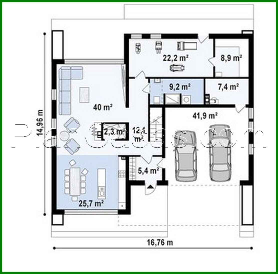 Flat two-story country house Number of floors: 2 Total area: 269.00 m2 House height: 7.55 m Ceiling Height: 2.80 m Roof Angle: 2 ° Roof area: 124.00 m2 Cubic capacity: 775.00 m3 Number of bedrooms: 3 Number of bathrooms: 3 Garage: Two-car garage Minimum plot size (length): 24.80 m Minimum plot size (width): 23.00 m Materials: Walls: aerated concrete, ceramic blocks Overlap: monolithic overlap Roofing: PVC membrane Foundation: monolithic tape band