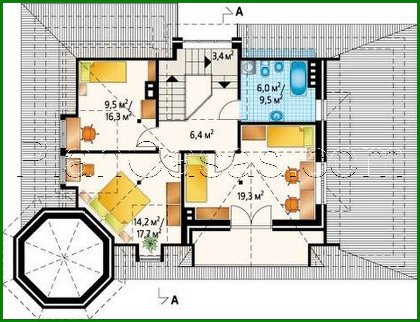 Unusual residential building resembling a castle Number of floors: 2 Total area: 189.50 m2 Living Area: 139.70 m2 House height: 8.80 m Ceiling Height: 2.40 m Roof angle: 45 °, 20 °, 55 ° Roof area: 278.00 m2 Cubic capacity: 848.00 m3 Number of bedrooms: 4 Number of bathrooms: 2 Garage: Garage for one car Minimum plot size (length): 24.60 m Minimum plot size (width): 22.40 m Built-up area: 155 m2 Materials: Walls: aerated concrete, ceramic blocks Overlap: monolithic overlap Roofing: ceramic tile, metal tile, cement-sand tile Foundation: monolithic tape
