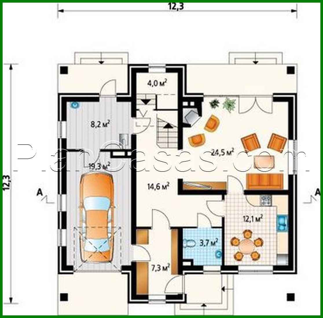 Majestic residential building under a gable roof Number of floors: 2 Total area: 191.30 m2 Living Area: 152.80 m2 Ceiling Height: 2.80 m Roof Angle: 27 ° Roof area: 192.00 m2 Cubic capacity: 1113.00 m3 Number of bedrooms: 4 Number of bathrooms: 2 Garage: Garage for one car Minimum plot size (length): 20.40 m Minimum plot size (width): 22.40 m Built-up area: 124 m2 Materials: Walls: aerated concrete, ceramic blocks Overlap: monolithic overlap Roofing: ceramic tile, metal tile, cement-sand tile Foundation: monolithic tape